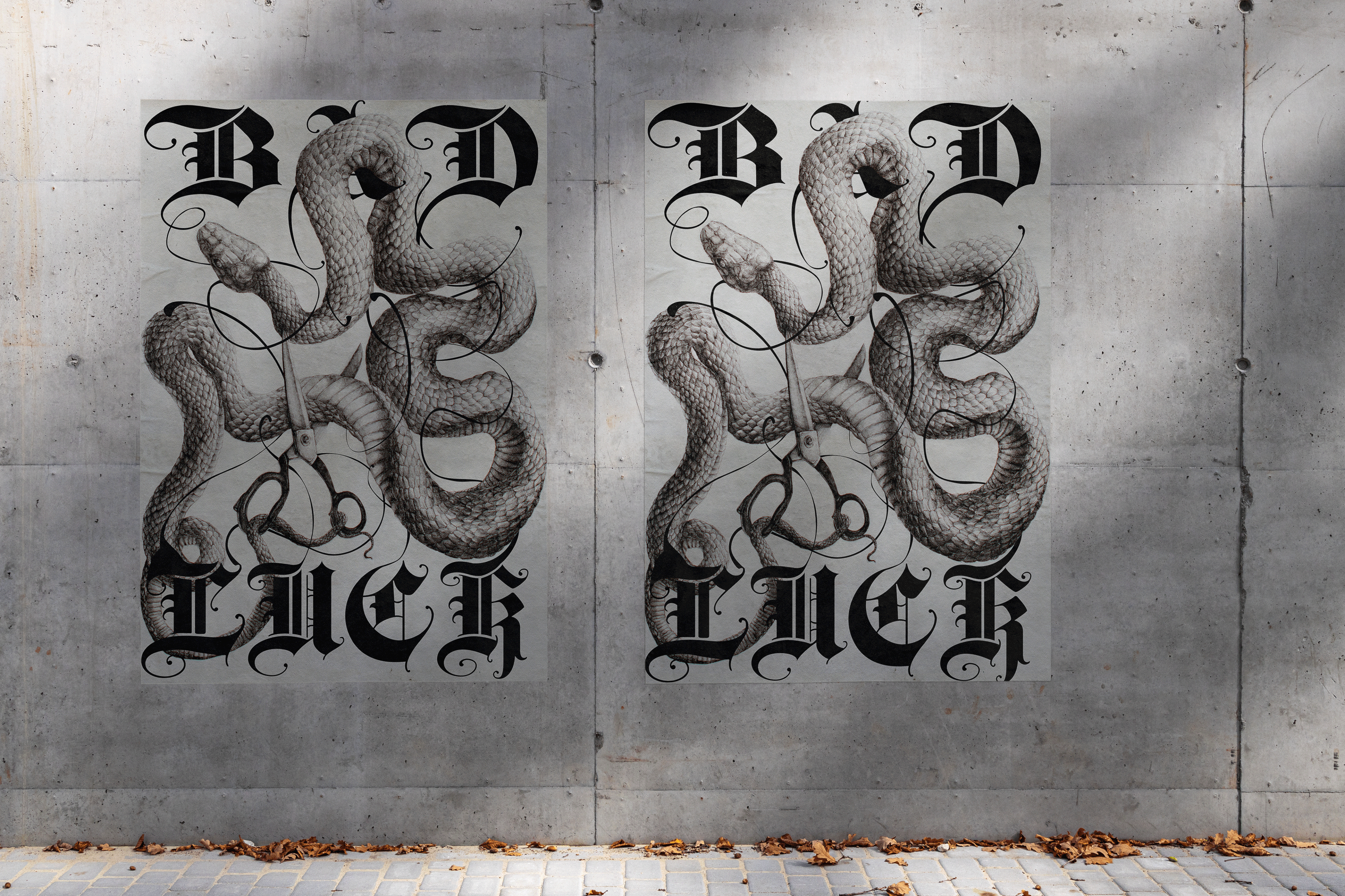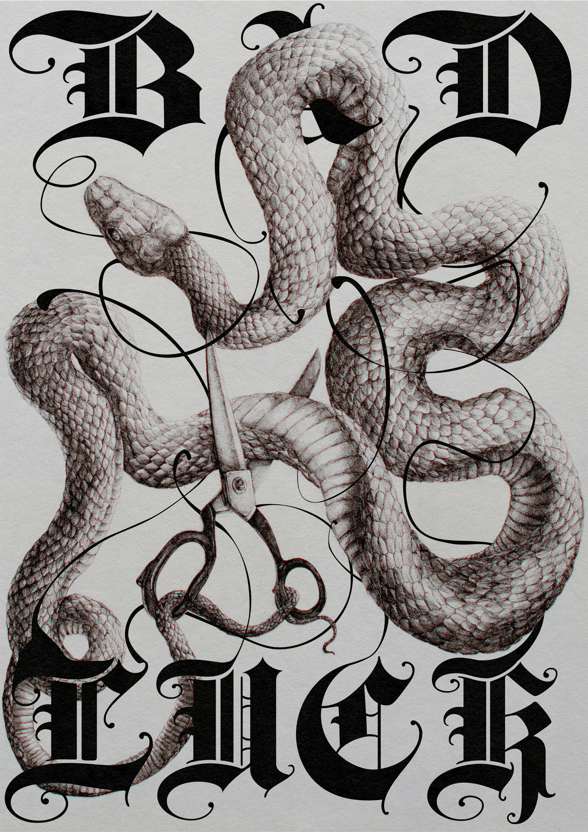 "Bad Luck" poster design - free time. For this design I used my analogue illustration "his fear will eat him alive" and combined it with graphical slightly expanded typography.